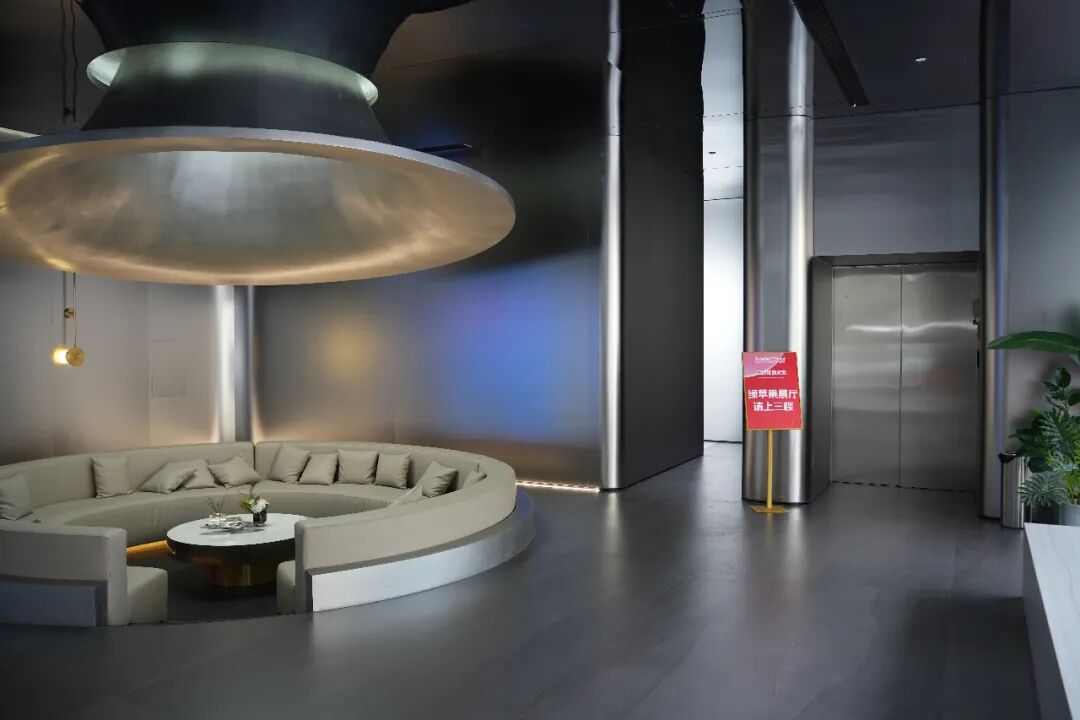 通過中庭右側電梯上至三樓,來訪者便完成了從整體敘事到品牌專屬美學空間的巧妙過渡,將訪客引入綠蘋果的核心美學世界。