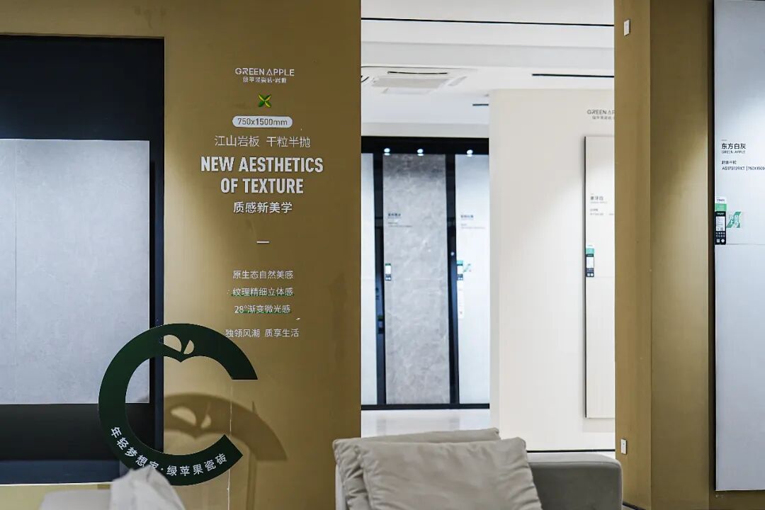 2025年10月17日,綠蘋果瓷磚總部展廳完成美學升級,新展廳富含品牌元素以及品牌獨特美學理念,展現新生代新潮設計的同時,更樹立了美學展廳的時代標桿。