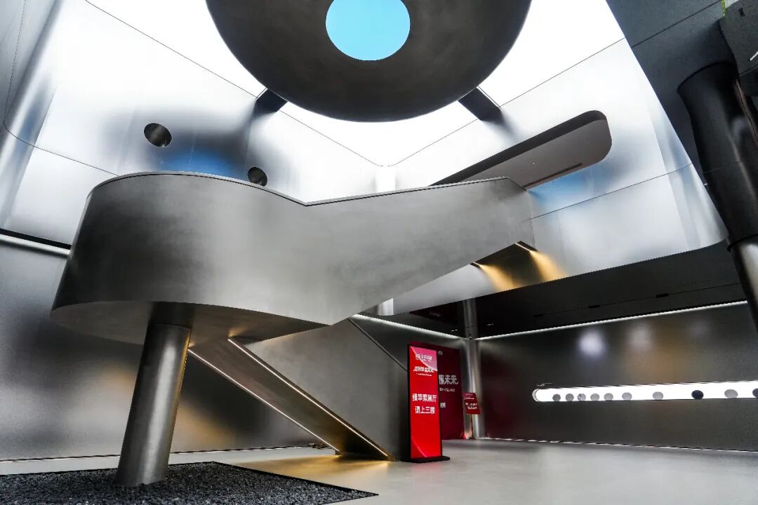 中庭摒棄了冗余的裝飾,選擇了更為冷靜和高級的表達——極簡立面。通過高規格的新型金屬復合材料,空間營造出一種充滿科技感與流水動感的純粹視覺效果,為接下來的展廳體驗設定了一個高標準的基調。