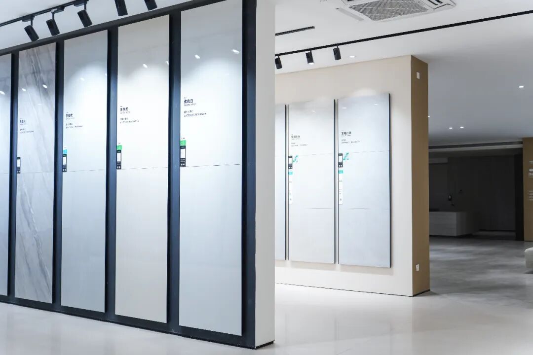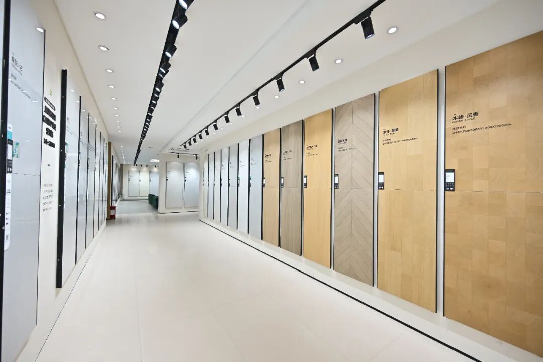 展廳選材區在延續原有布局的基礎上,注入新的系列與色彩體系,以材質、規格、工藝的多維組合,呈現出更清晰的產品邏輯與搭配美感。選材區與生活空間模擬區相互銜接,形成動靜交融的觀展動線,讓觀者能夠全景式體驗產品在不同空間中的應用效果。