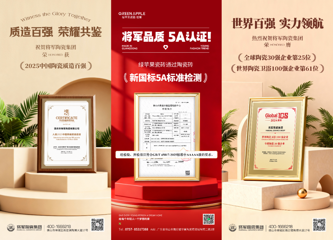 2025年10月中旬,綠蘋果瓷磚率先通過新國標《消費品質量分級 陶瓷磚》GB/T45817—2025的AAAAA級檢測認證,以及所屬的將軍陶瓷集團還入選“2025中國陶瓷質造百強”及榮膺全球陶瓷30強及世界陶瓷衛浴100強。彰顯了綠蘋果瓷磚背靠將軍陶瓷集團擁有強大的產品品質,更是全面體現其在生產實力、智造實力、技術創新等綜合水平屹立于行業潮頭。