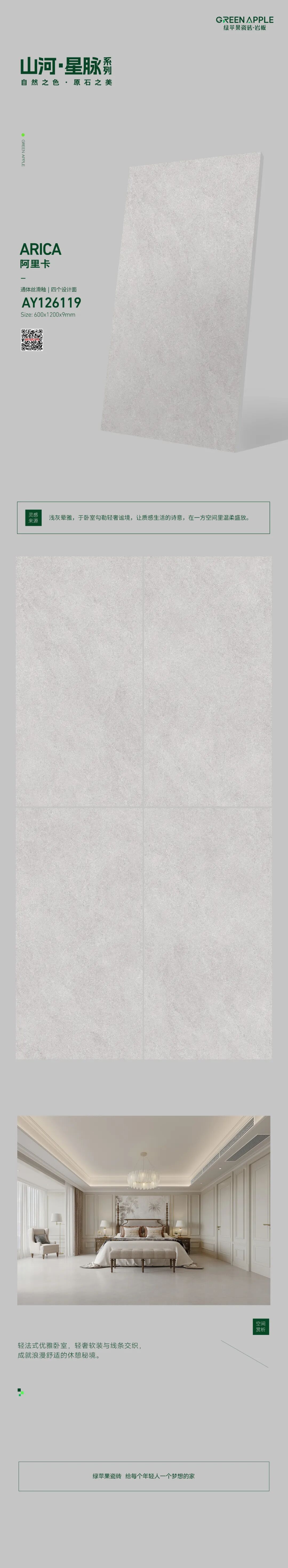 綠蘋果瓷磚·巖板創立于廣東佛山,始于 2010 年,背靠實力強大的將軍陶瓷集團,長久堅持自主設計、研發、生產,讓綠蘋果的...