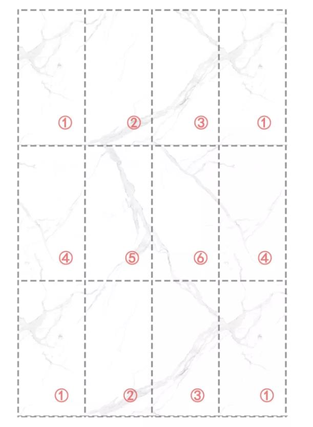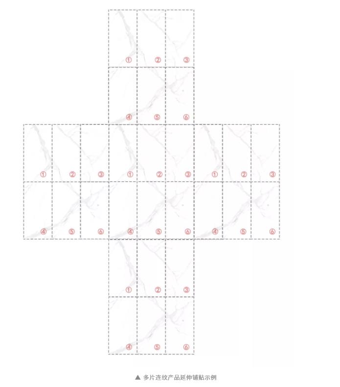 要實現連紋延伸、大氣流暢的鋪貼效果,連紋設計產品在鋪貼時,需要根據同一編號產品的花色序號順序,按照指定方向進行組合平鋪。