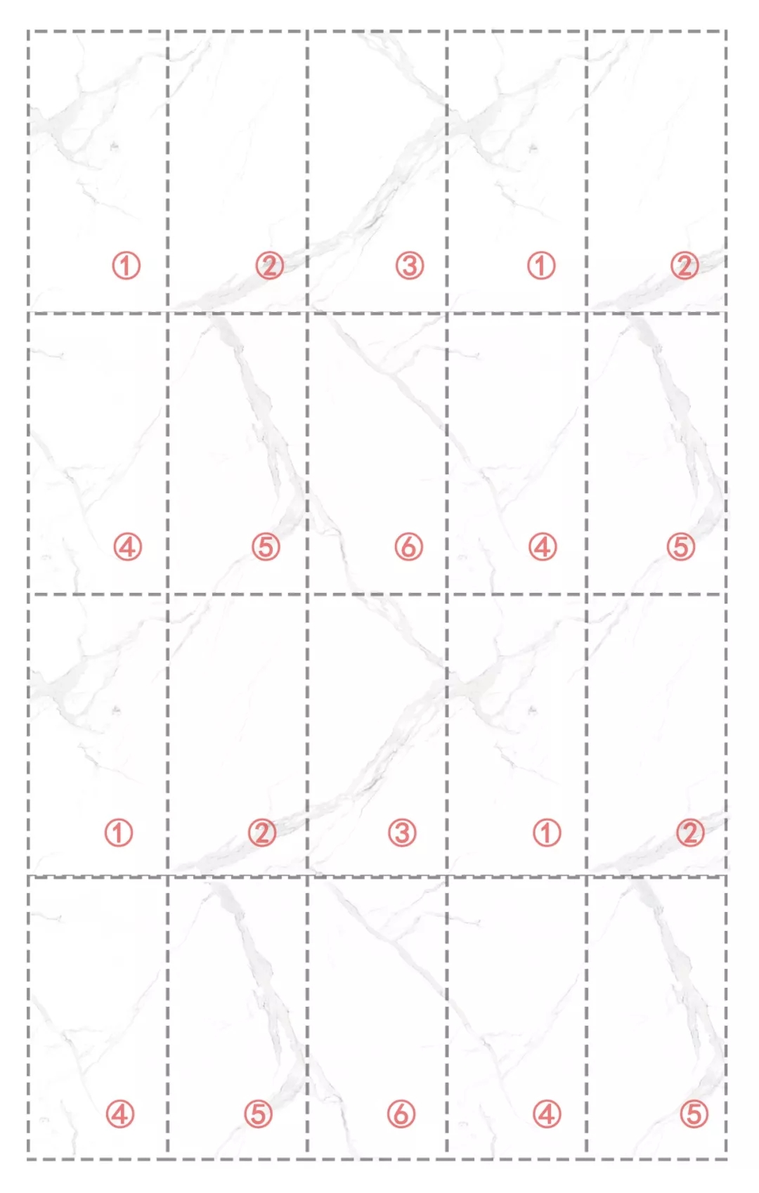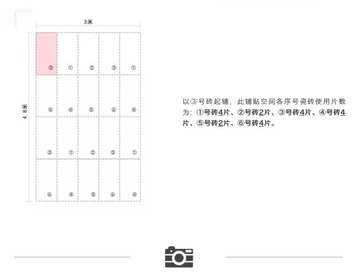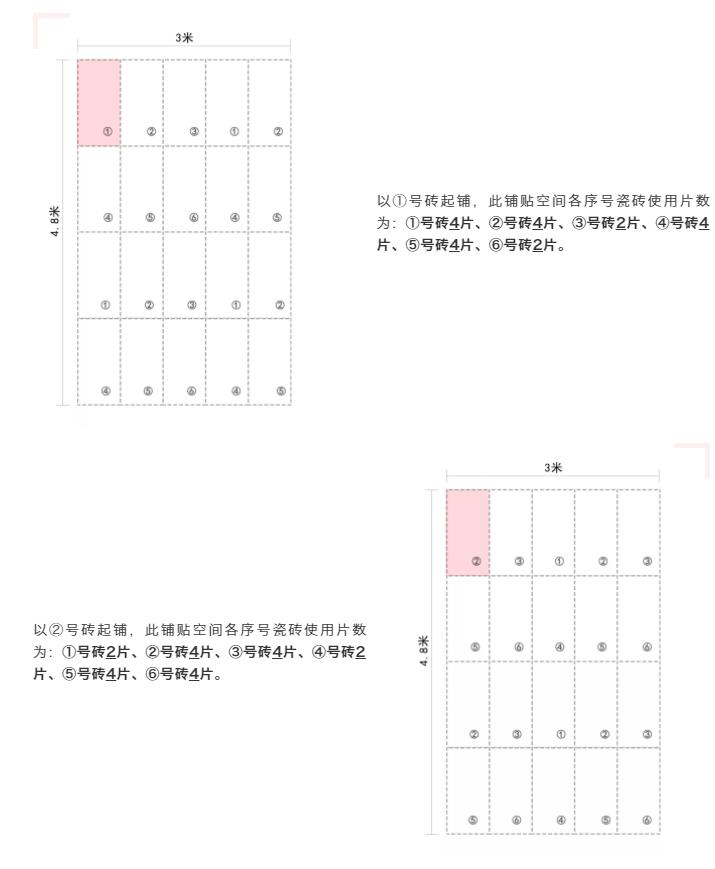 為達到鋪貼效果和產品利用率的最大化,終端在銷售和鋪貼連紋設計產品的時候,可根據同一編號各序號產品庫存量的實際情況以及鋪貼用磚的情況,選擇某個序號作為起始磚鋪貼。